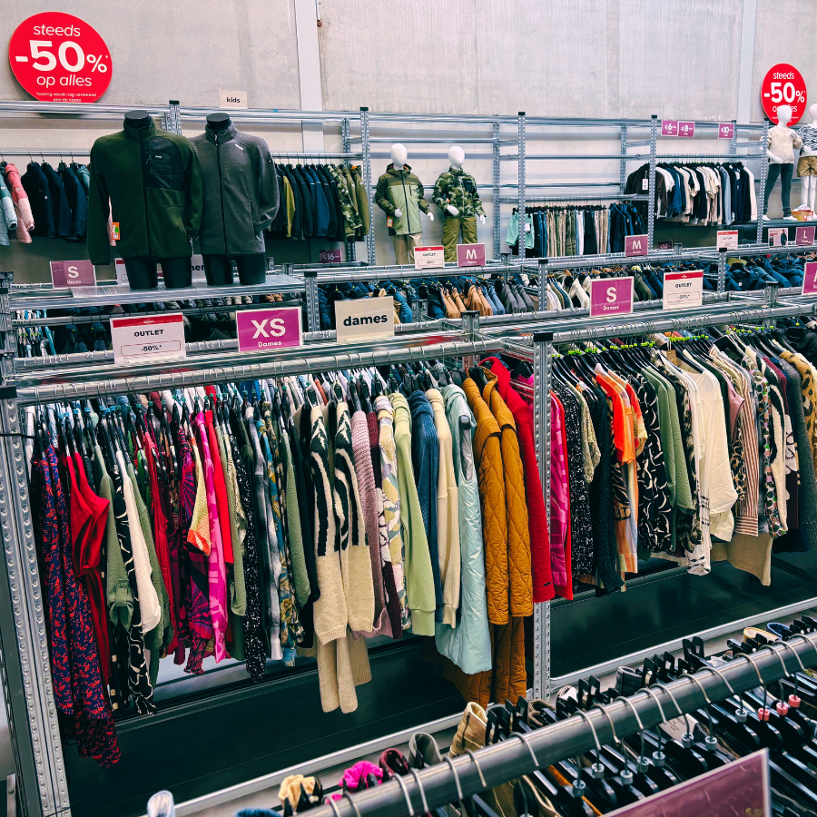 Onze outlet is overzichtelijk ingedeeld op geslacht, maat en afdeling, zodat je snel vindt wat bij jou past. De meeste artikelen zijn ook online te bekijken, herkenbaar aan het -50% kortingslabel, maar de volledige collectie vind je alleen in de winkel. Op de webshop ontbreken vaak producten uit de outlet, waardoor een bezoek aan de winkel de enige manier is om écht alles te ontdekken. Omdat de collectie regelmatig wordt aangevuld, valt er bovendien altijd iets nieuws te ontdekken bij elk bezoek.